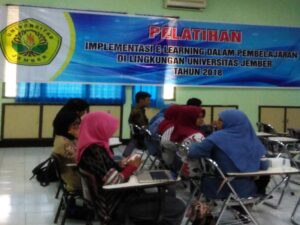 Sesi awal pelatihan Implementasi E-Learning Dalam Pembelajaran di lingkungan Universitas Jember disampaikan oleh Dr. Lutfi Rohman, S.Si, M.Si. dari Jurusan Fisika tentang materi E-Learning Universitas Jember. Mulai tahap prosedur pembuatan, pengelolaan, setting, hingga mengeditan mata kuliah disampaikan pemateri dan langsung dipraktekkan oleh para dosen di lingkungan FMIPA. Dan juga bagaimana cara memasukkan perangkat pembelajaran mata kuliah yang terdiri Silabus, RPS dan Kontrak Kuliah pada E-learning. Bagian akhir adalah melihat hasil dari proses itu melalui SISTER pada menu Akademik dan sub menu Perkuliahan. Tanya jawab dan pendampingan juga diberikan pada saat penyampaian materi.
