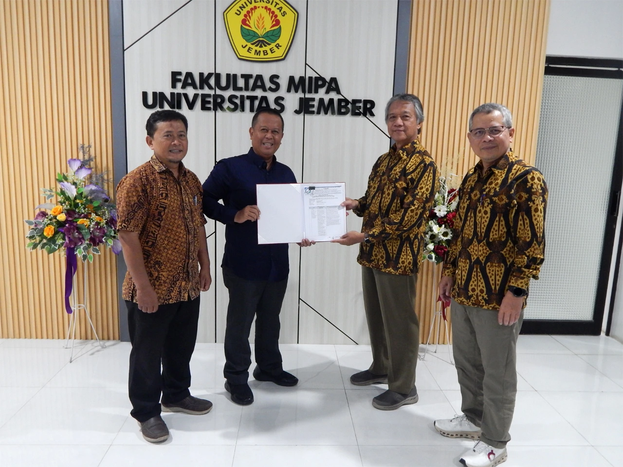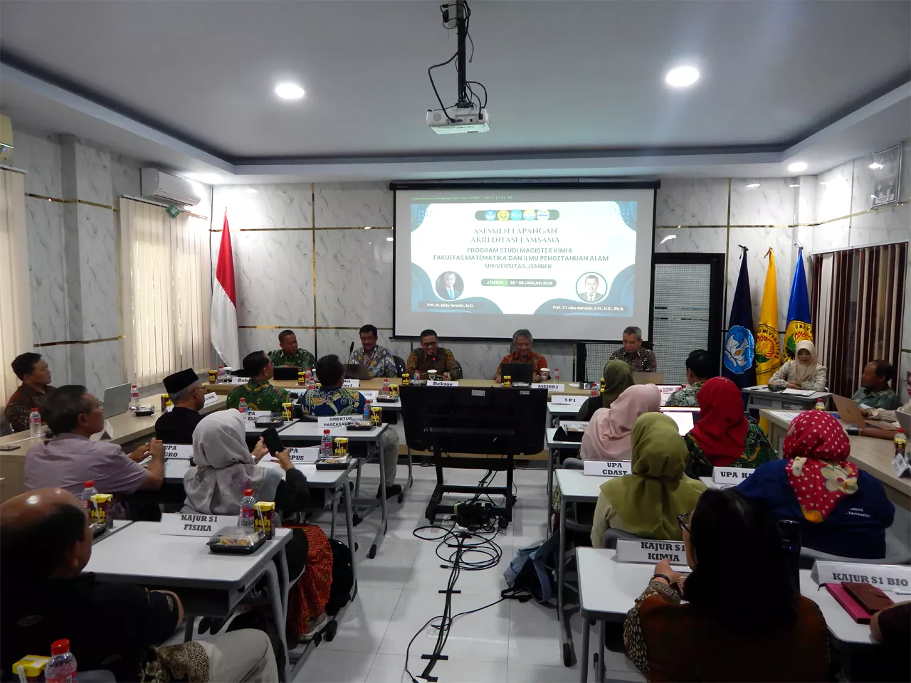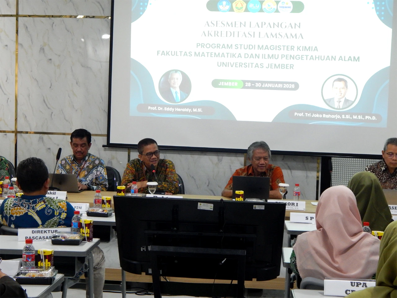 Tim Lembaga Akreditasi Mandiri Sains Alam dan Ilmu Formal (LAMSAMA) selenggarakan asesmen lapangan akreditasi Program Studi Magister Kimia Fakultas Matematika dan Ilmu Pengetahuan Alam Universitas Jember. Rektor Universitas Jember Dr. Ir. Iwan Taruna, M.Eng., IPM., ASEAN Eng. dan Wakil Rektor UNEJ bidang Akademik Prof. Drs. Slamin, M.Comp.Sc., Ph.D. bersama Dekan FMIPA UNEJ Prof. Drs. Dafik, M.Sc., Ph.D. dampingi tim asesor dalam acara pembukaan asesmen lapangan (28-29/1). Tim asesor terdiri Prof. Dr. Eddy Heraldy, M.Si. dari Universitas Sebelas Maret Surakarta dan Prof. Tri Joko Raharjo, S.Si., M.Si., Ph.D. dari Universitas Gajah Mada Yogyakarta.
