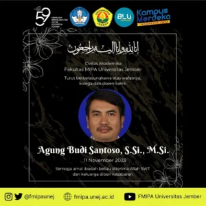 Telah berpulang ke Rahmatullah Agung Budi Santoso, S.Si., M.Si. Dosen Jurusan Kimia FMIPA Universitas Jember pada Sabtu, 11 November 2023. Almarhum bergabung menjadi dosen di Jurusan Kimia FMIPA sejak Maret tahun 1998. Alumnus Universitas Brawijaya (S1) tahun 1997 dan Institut Teknologi Bandung (S2) tahun 2003 tersebut mengajar bidang Biokimia selama mengabdi menjadi seorang dosen. Almarhum meninggalkan dua orang putra.