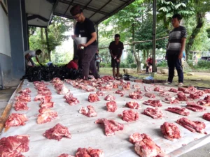 JULEHA is a Halal Cow Slaughterer who has expertise and dedication in slaughtering animals and ensuring the halalness of meat. With one breath, Prof. Bayu’s thrust successfully slaughtered the sacrificial cow. After the shohibul kurban was read by Dr. Bambang Piluharto as a representative of the Baitul Ilmi mosque committee. Next, the slaughtering of the sacrificial goat was accompanied by Prof. Bayu. It didn’t take long, the process of slaughtering the cow and goat was completed. The sacrificial committee with equipment immediately worked together to sort the sacrificial meat to be distributed. Vice Deans I, II, and III of FMIPA accompanied by the Head of General Affairs of FMIPA were directly involved in the process.