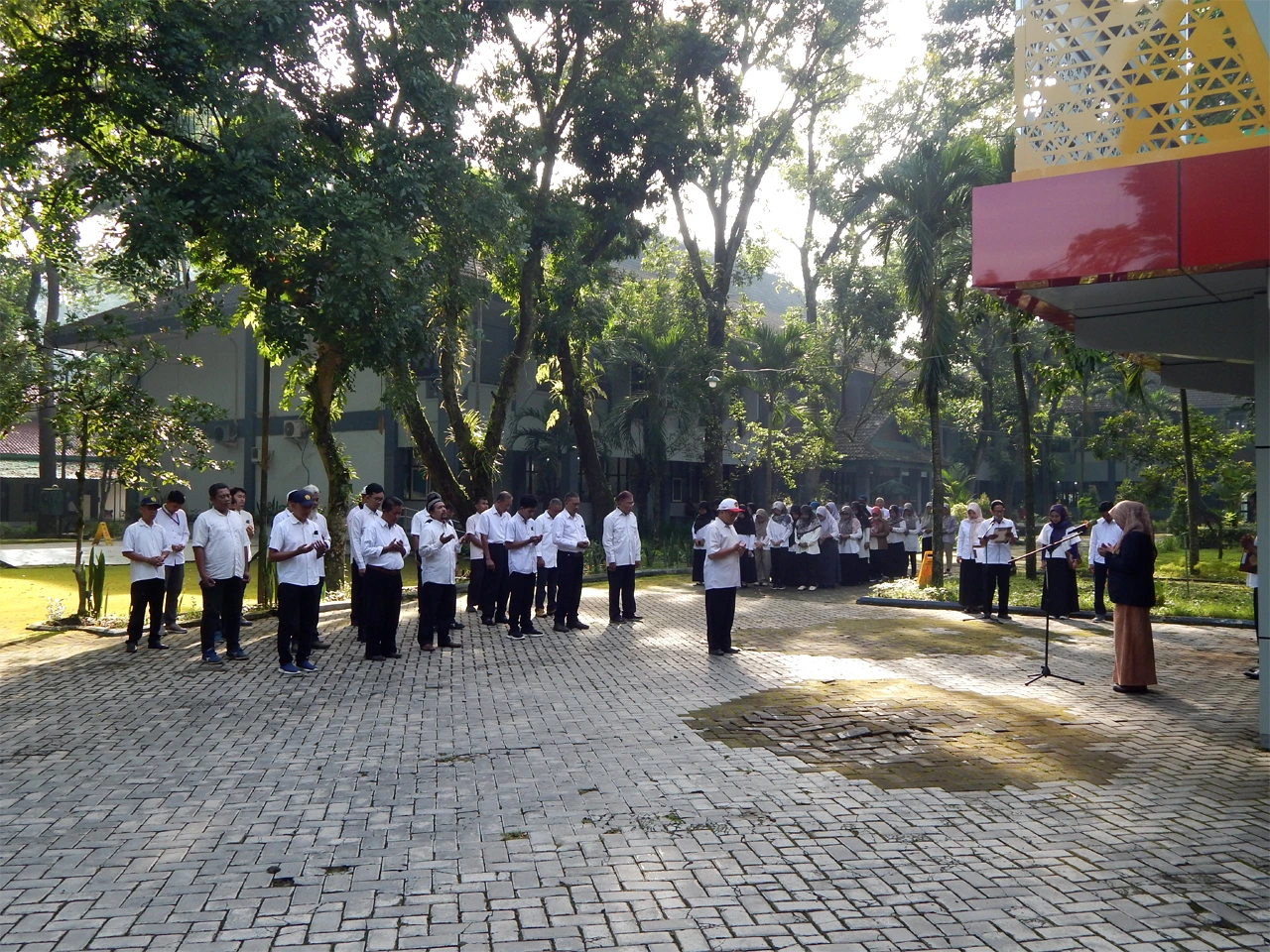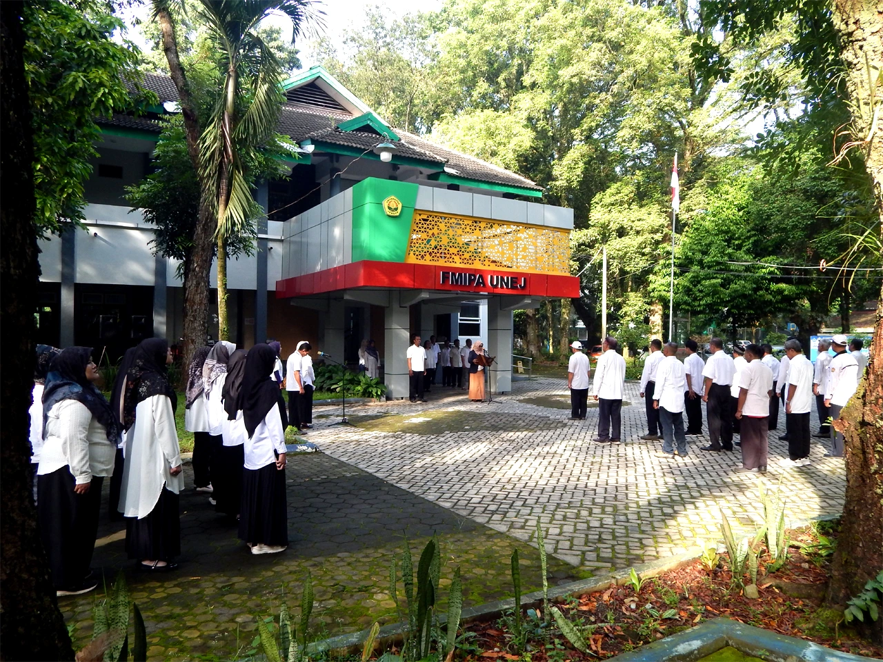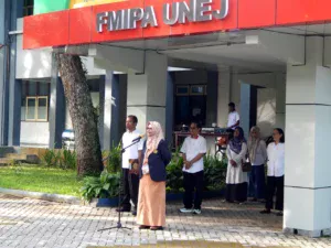Today’s morning roll call for the Faculty of Mathematics and Natural Sciences, UNEJ, was the turn of officers from the FMIPA Dean’s Office. The leadership of the Faculty of Mathematics and Natural Sciences (FMIPA) at UNEJ has implemented a monthly rotation of morning roll call officers, attended by all members of the FMIPA academic community. In his address, Prof. Hari also reminded the students about the special learning activities in this even semester, which includes several holidays. “Students, as consumers, must receive good service, especially during lectures. This semester will have many holidays, so lecturers must be able to organize their schedules so that students are well-served,” she hoped. If students encounter difficulties, the active role of their advisors is highly expected to be present to resolve them.