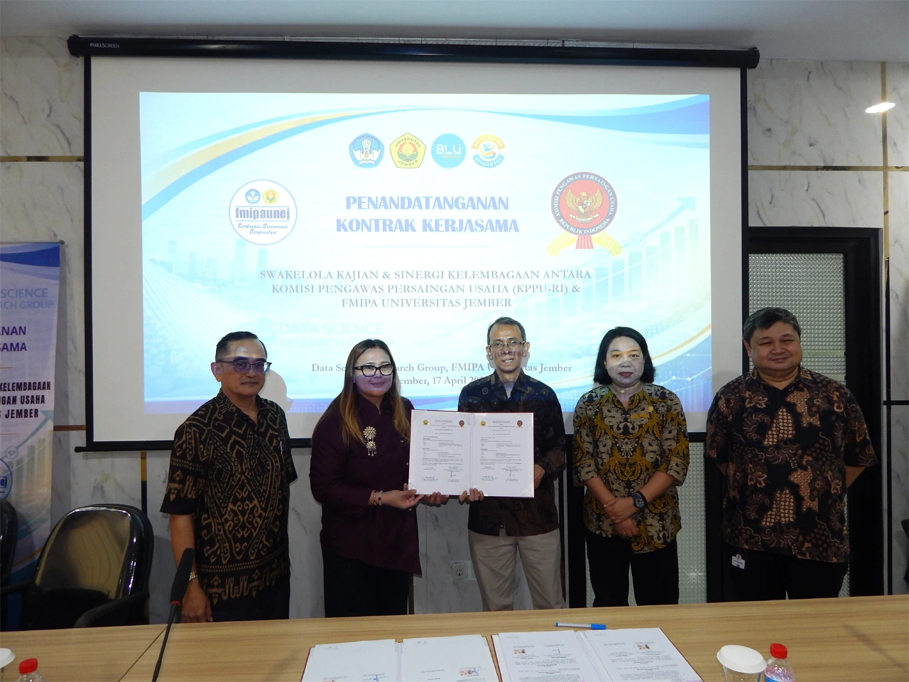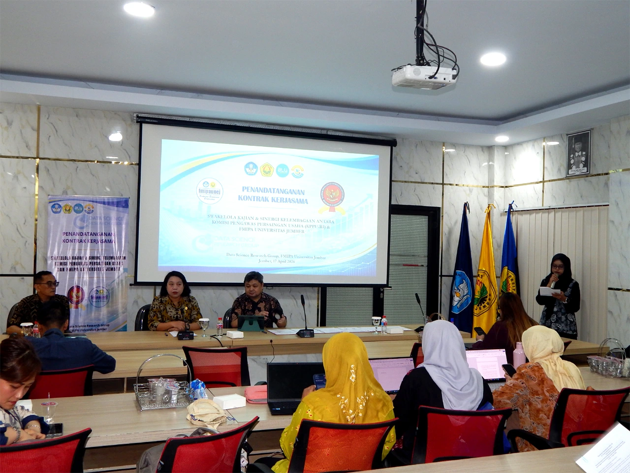 Fakultas MIPA Universitas Jember dan Komisi Pengawas Persaingan Usaha Republik Indonesia (KPPU-RI) jalin kerja sama Swakelola Kajian dan Sinergi Kelembagaan (17/4). Hadir Komisioner KPPU-RI Dr. Eugenia Mardanugraha, S.Si., M.E. didampingi Direktur Ekonomi, PPK KPPU, Kepala Bidang Kajian Kanwil Surabaya dan beberapa staf. Tim KPPU disambut Prof. Dr. Edy Supriyanto, S.Si., M.Si. Wakil Dekan III mewakili Dekan FMIPA UNEJ didampingi Dr. Alfian Futuhulhadi, S.Si., M.Si serta anggota KeRis Data Science. Penandatangan Perjanjian Kerja Sama FMIPA dan KPPU-RI di inisiasi oleh KeRis Data Science Jurusan Matematika FMIPA dalam wujud Kegiatan Kajian Penyempurnaan Desain Sampel dan Komposisi Responden Indeks Persaingan Usaha.