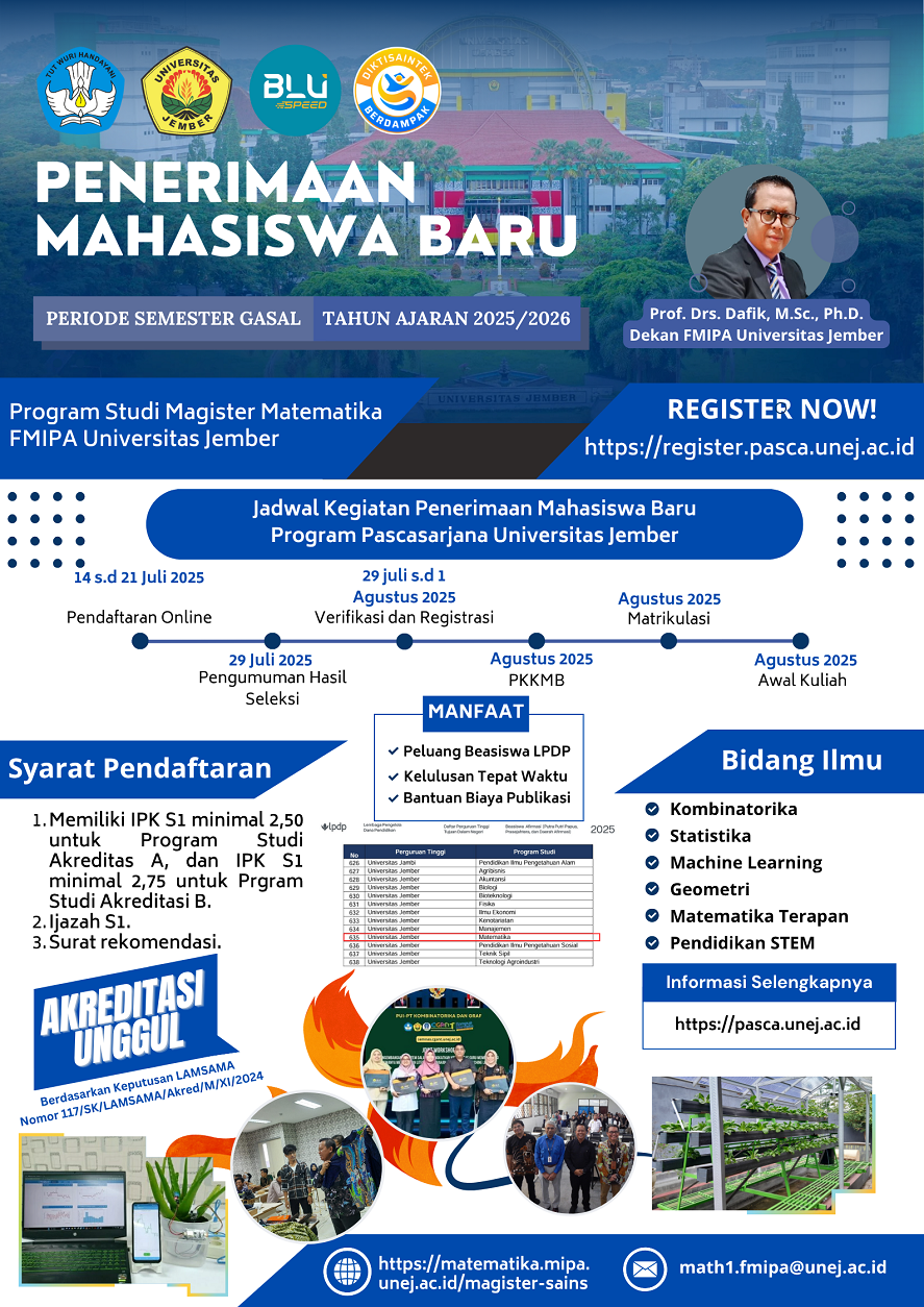 “Terus latih dan tingkatkan penggunaan bahasa asing khususnya Bahasa Inggris, asah melalui kursus atau membiasakan diri untuk berlatih mandiri. Karena hampir semua bidang pekerjaan atau lowongan beasiswa mensyaratkan Bahasa Inggris khususnya TOEFL di dalamnya” pungkasnya. Pelepasan Alumni Pasca Sarjana (S2) XXVIII dan Sarjana (S1) LVIX Periode VI Tahun Akademik 2017/2018 diikuti oleh 45 Calon Wisudawan Wisudawati Sarjana dan Pasca Sarjana dengan rincian 10 orang Program Studi Matematika, 8 orang Program Studi Fisika, 3 orang Program Studi Kimia, 20 orang Program Studi Biologi, dan 4 orang Program Studi Magister Matematika.