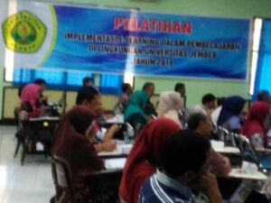 Sesi awal pelatihan Implementasi E-Learning Dalam Pembelajaran di lingkungan Universitas Jember disampaikan oleh Dr. Lutfi Rohman, S.Si, M.Si. dari Jurusan Fisika tentang materi E-Learning Universitas Jember. Mulai tahap prosedur pembuatan, pengelolaan, setting, hingga mengeditan mata kuliah disampaikan pemateri dan langsung dipraktekkan oleh para dosen di lingkungan FMIPA. Dan juga bagaimana cara memasukkan perangkat pembelajaran mata kuliah yang terdiri Silabus, RPS dan Kontrak Kuliah pada E-learning. Bagian akhir adalah melihat hasil dari proses itu melalui SISTER pada menu Akademik dan sub menu Perkuliahan. Tanya jawab dan pendampingan juga diberikan pada saat penyampaian materi.