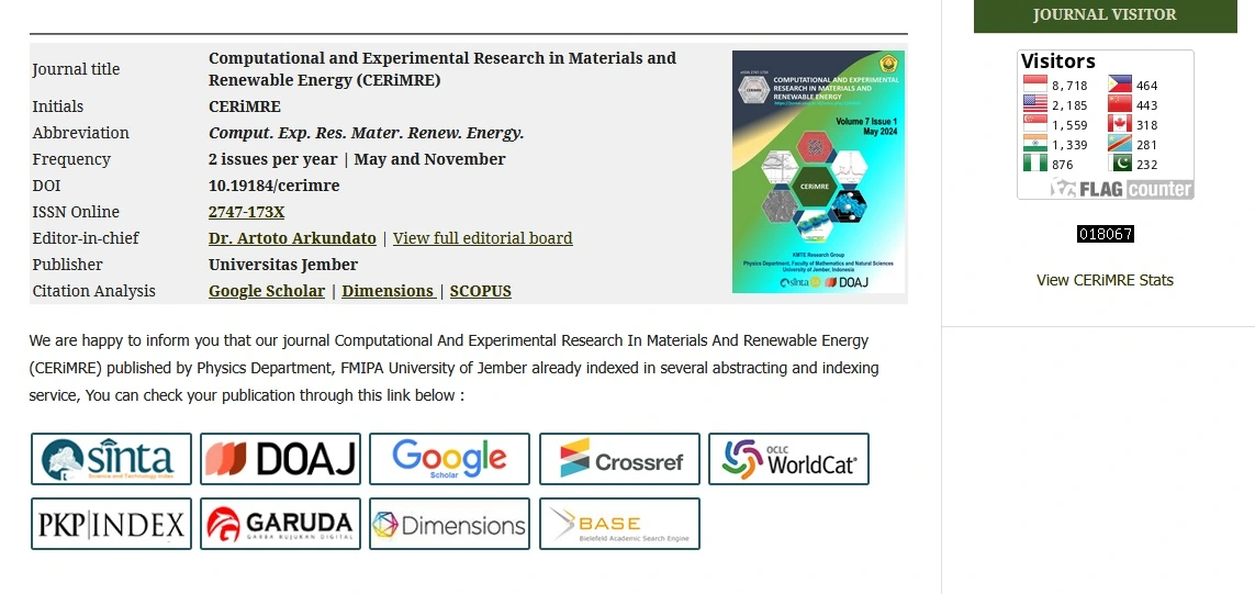 Jurnal CERiMRE menerbitkan artikelnya sejak tahun 2018 dengan menggunakan bahasa inggris dan penulis dari beberapa negara. Penulis dari benua Afrika seperi Kongo, Nigeria, dan Ghana. Negara dari Asia pun turut seperti India, China, Jepang, Iran dan tentunya Indonesia. CERiMRE yang dipimpin Dr. Dr. Artoto Arkundato, S.Si., M.Si. sebagai Editor-in-chief, telah persiapkan proses re-akreditasi SINTA melalui pematangan persyaratan dari ARJUNA. Peningkatan kualitas substansi artikel menjadi fokus utama dalam pembenahan. Mendatangkan pakar dari pengelola jurnal terakreditasi internasional sebagai pendamping juga salah satu menaikkan akreditasi SINTA jurnal CERiMRE.