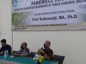 “Bagaimana komposisi mangrove, pola distribusi mangrove kemudian bagaimana pola sistem faktor edafik yang ada di hutan mangrove hutan Taman Nasional Baluran” jelas awal Prof. Sudarmadji, M.A., Ph.D. pakar hutan mangrove yang juga dosen Jurusan Biologi FMIPA Universitas Jember dalam acara Farewell Lecture dengan tema Struktur Komunitas Mangrove di Taman Nasional Baluran Indonesia (10/6). Prof. Dar demikian biasa dipanggil adalah dosen senior FMIPA UNEJ yang telah banyak menghasilkan penelitian bagi lembaga dan negara dalam bidang mangrove. “Komposisi hutan mangrove terdiri atas 22 famili, 27 genus, dan 36 spesies, lalu pola sistem faktor edafik hutan mangrove di Taman Nasional Baluran adalah kombinasi” lanjutnya di hadapan tamu undangan yang merupakan kolega, mantan mahasiswa dan juga pimpinan FMIPA UNEJ. Prof. Dar juga memberikan saran eksploitasi hutan mangrove, kandungan materi organik tidak boleh dikuras terlalu banyak, industri perikanan yang berdekatan dengan hutan mangrove harus menjaga dan mengelola dengan baik dan profil diagram, distribusi, dan densitas berguna bagi pemangku kebijakan dalam menentukan area mangrove yang akan dipotong pada waktu tertentu.
