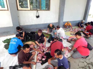 Takmir masjid Baitul Ilmi, warga FMIPA dibantu IONS FMIPA memilah daging sapi dan kambing hingga rata. Kebersamaan tiap tahun ini menambah kekompokan seluruh warga FMIPA. Ada yang menguliti, memotong daging kurban,memecah tulang hewan kurban dan juga bertugas menimbang. “Tanpa ada penugasan khusus, warga FMIPA beserta adik-adik IONS langsung bekerja ambil bagian dalam proses pemotongan hewan kurban,” ungkap Dr. Esti Utarti, Wakil Dekan II FMIPA. Disisi lain Ibu-ibu tendik FMIPA persiapkan jamuan untuk santap makan siang. Persiapan sebelumnya dilakukan pagi harinya, kayu untuk menguliti, terpal di samping Gedung Dekanat FMIPA UNEJ.