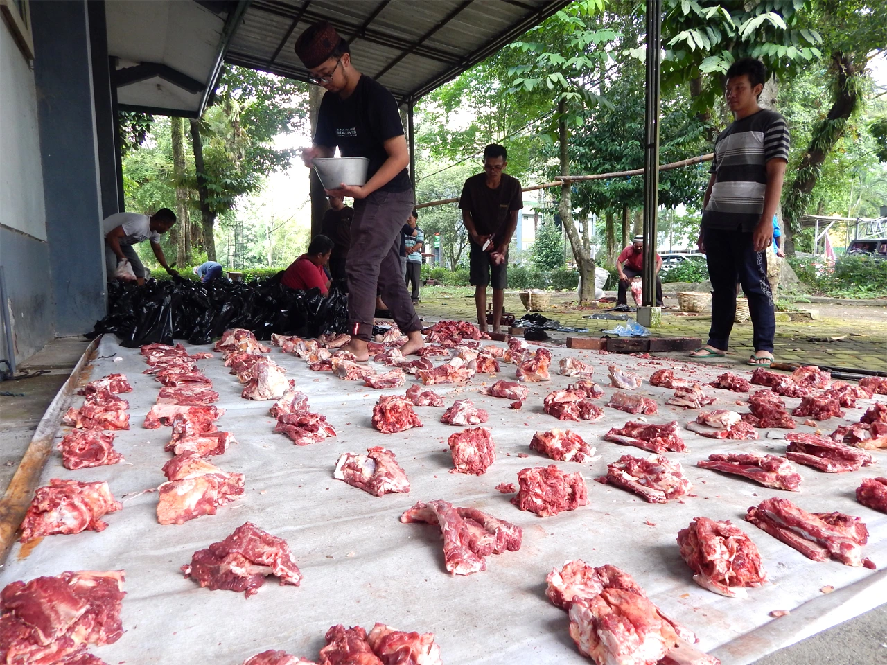 Takmir masjid Baitul Ilmi, warga FMIPA dibantu IONS FMIPA memilah daging sapi dan kambing hingga rata. Kebersamaan tiap tahun ini menambah kekompokan seluruh warga FMIPA. Ada yang menguliti, memotong daging kurban,memecah tulang hewan kurban dan juga bertugas menimbang. “Tanpa ada penugasan khusus, warga FMIPA beserta adik-adik IONS langsung bekerja ambil bagian dalam proses pemotongan hewan kurban,” ungkap Dr. Esti Utarti, Wakil Dekan II FMIPA. Disisi lain Ibu-ibu tendik FMIPA persiapkan jamuan untuk santap makan siang. Persiapan sebelumnya dilakukan pagi harinya, kayu untuk menguliti, terpal di samping Gedung Dekanat FMIPA UNEJ.