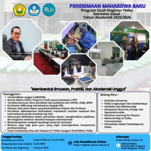 Universitas Jember Program PascaSarjana Magister Sains Fisika membuka Penerimaan Mahasiswa Baru. Pendaftaran Secara online melalui laman sister.unej.ac.id/site/seleksipasca.