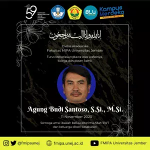 Telah berpulang ke Rahmatullah Agung Budi Santoso, S.Si., M.Si. Dosen Jurusan Kimia FMIPA Universitas Jember pada Sabtu, 11 November 2023. Almarhum bergabung menjadi dosen di Jurusan Kimia FMIPA sejak Maret tahun 1998. Alumnus Universitas Brawijaya (S1) tahun 1997 dan Institut Teknologi Bandung (S2) tahun 2003 tersebut mengajar bidang Biokimia selama mengabdi menjadi seorang dosen. Almarhum meninggalkan dua orang putra.