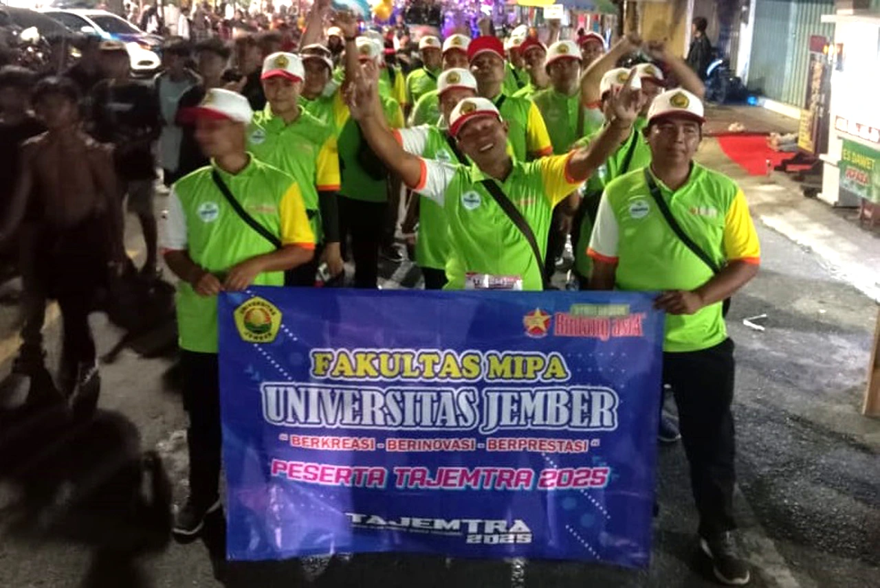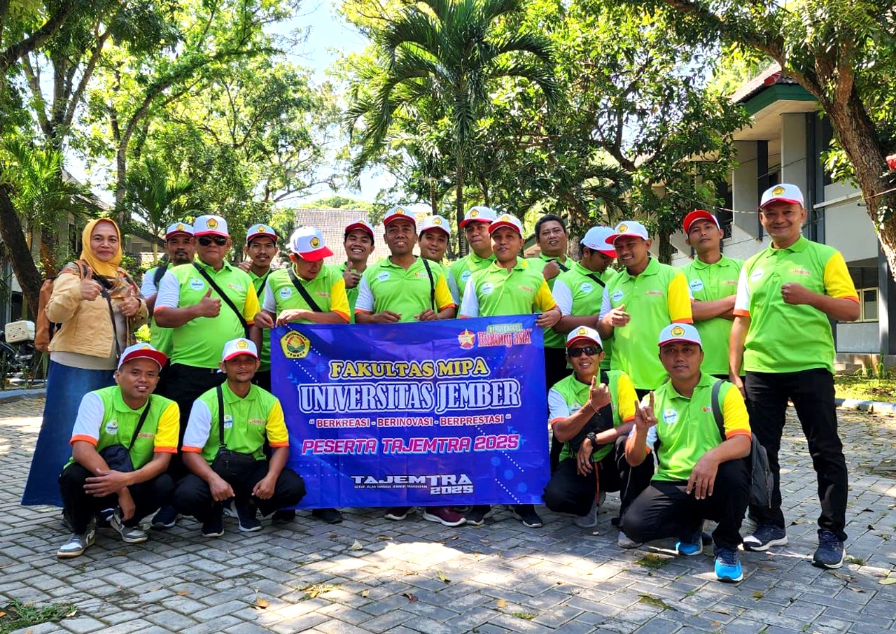 TAJEMTRA 2025 kembali digelar, sebuah acara tradisional tahunan yang diselenggarakan oleh Pemerintah Kabupaten Jember, dan menjadi agenda rutin tim FMIPA UNEJ mengikuti TAJEMTRA. Beranggotakan tenaga kependidikan FMIPA, tim ikut ambil bagian dalam kegiatan jalan sejauh 30 kilometer dari Tanggul ke Jember (23/8). Tahun ini, kembali membentangkan spanduk jargon FMIPA UNEJ Berkreasi, Berinovasi dan Berprestasi, ingin gaungkan jargon FMIPA UNEJ ke masyarakat luar. “Selain berolah raga, tim FMIPA UNEJ miliki visi untuk gaungkan FMIPA UNEJ ke masyarakat Jember, gudangnya calon scientist muda,” ungkap Verry, koordinator tim FMIPA UNEJ. Dukungan juga datang dari pimpinan FMIPA UNEJ, Dekan dan para Wakil Dekan FMIPA. Selain dana, dukungan moril dengan turut melepas keberangkatan tim FMIPA UNEJ.