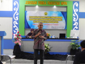 Dr. Lutfi Rohman, S.Si. M.Si. selaku Ketua Panitia Penyelenggara menyampaikan kegiatan tersebut diikuti 55 orang peserta fungsionaris ormawa di lingkungan FMIPA UNEJ dan 10 orang dari Politeknik Negeri Jember (POLIJE). Pemateri selanjutnya adalah Dekan FMIPA Universitas Jember Drs. Achmad Sjaifullah, M.Sc., Ph.D. yang mengajak fungsionaris ORMAWA FMIPA khususnya meningkatkan kompetensi dengan menjadikan pedoman kegiatan sebagai acuan. “Tujuan dari meningkatnya pengelolaan kegiatan mahasiswa adalah suatu capaian prestasi yang juga nanti akan mendukung suatu akreditasi institusi. Terapkan dan pihak fakultas akan menfasilitasnya” himbaunya.
