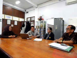 Siang harinya, FMIPA juga mendapatkan kunjungan monev dari Lembaga Penjaminan Mutu dan Pengembangan Pembelajaran (LPMPP) UNEJ. Diterima Wakil Dekan III FMIPA UNEJ Prof. Dr. Edy Supriyanto, S.Si., M.Si. didampingi Kabag Umum FMIPA Muhayat Zamroni, S.S. Tim LPMPP terdiri Ns. Jon Hafan Sutawardana S.Kep., M.Kep., Sp.Kep.MB dan Riska Rian Fauziah, S.Pt., M.P. menanyakan kesiapan yang telah dilakukan FMIPA dalam pelaksanaan PKKMB. Mulai sarana prasarana, materi PKKMB, posko kesehatan, layanan, hingga pengenalan mitigasi bencana. Kunjungan diakhiri dengan berkeliling ke tiap kelas di FMIPA UNEJ.