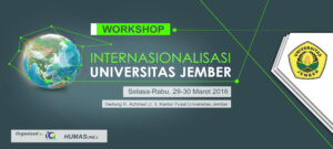 workshop-IO_humasWorkshop Internasionalisasi Universitas Jember yang diselenggarakan oleh International Office Universitas Jember dan bekerja sama dengan Humas Universitas Jember berlangsung pada tanggal 29 – 30 Maret 2016 di Gedung R. Achmad Lantai 3 Kantor Pusat Universitas Jember. Acara dibuka secara resmi oleh Rektor Universitas Jember Drs. Moh Hasan, M.Sc., Ph.D. Dalam sambutannya, Rektor mengajak kepada seluruh elemen civitas akademika untuk berani Go Internasional baik melalui seleksi karya ilmiah, pertukaran pelajar maupun studi lanjut bagi dosen dan mahasiswanya untuk bersaing di Perguruan Tinggi Internasional. Universitas Jember mendorong kepada dosen, karyawan maupun mahasiswa untuk bersama-sama meningkatkan kinerja agar mampu di kenal secara Nasional maupun Internasional dan webometrics sebagai tolak ukurnya.